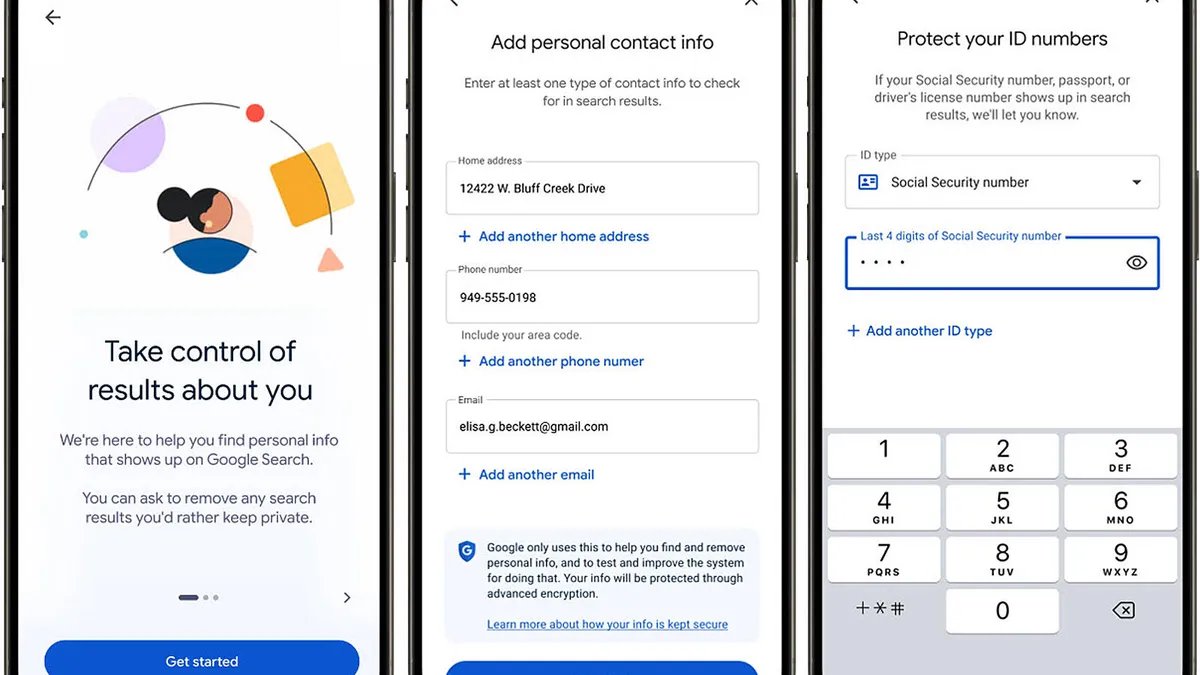 On the web, head to the Results about you hub. In the Google app, select your account photo, then tap “Results about you.” If you've never requested the removal of personal info before, select the Get Started button. You'll be asked to add your contact details, including your name, home address, phone number, and email address. If you've used this before, select the gear icon at the top to modify any information you've already added.
